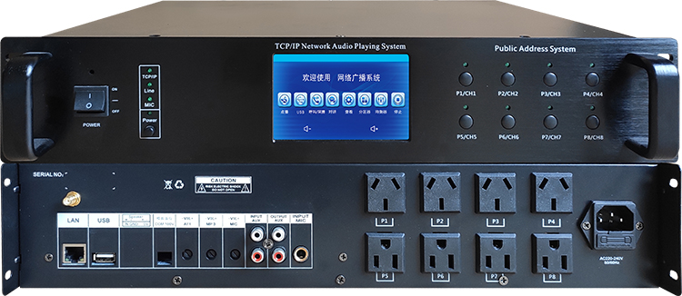 3)1路LAN网络接口,1路外部AUX输入,1路AUX本地输出,1路MIC本地输入,音量单独调节;