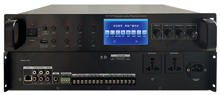 1)网络音频解码,网络音频编码采集,8路分区可编程管理,双向对讲于一体;